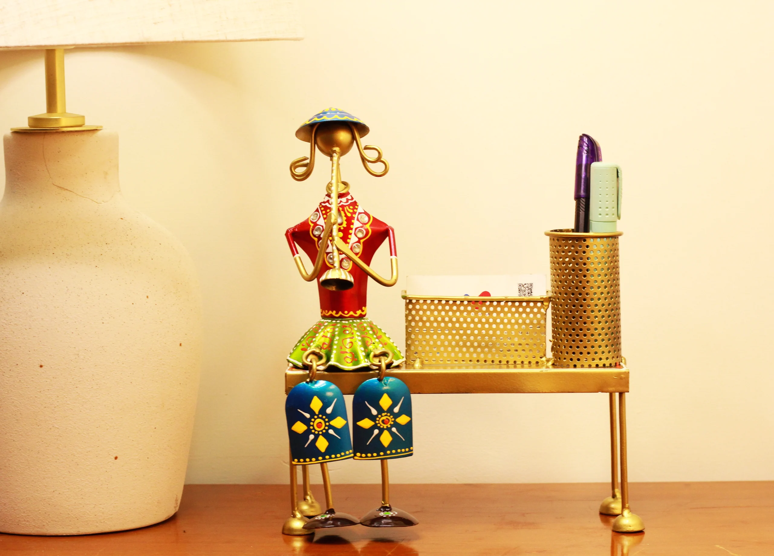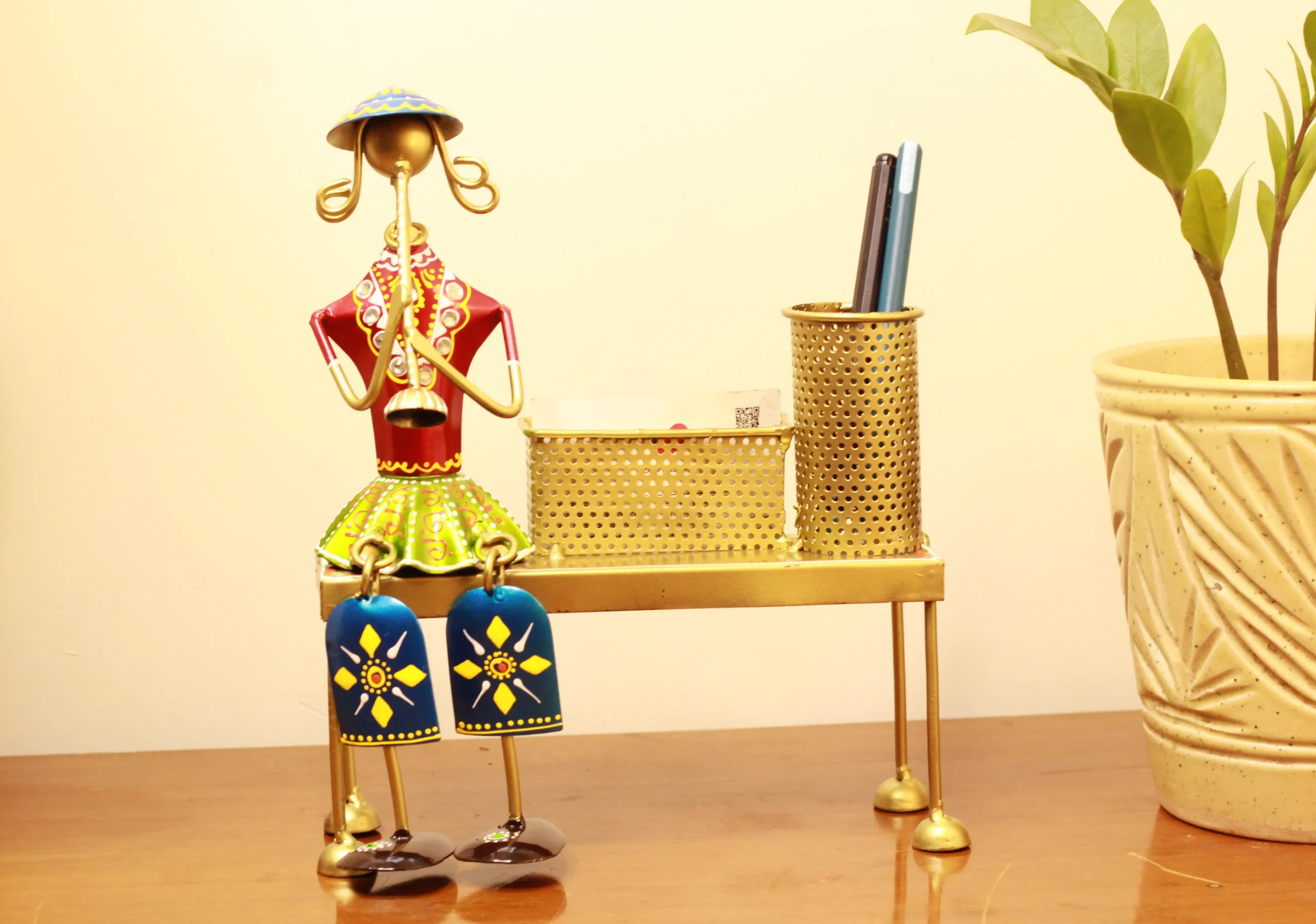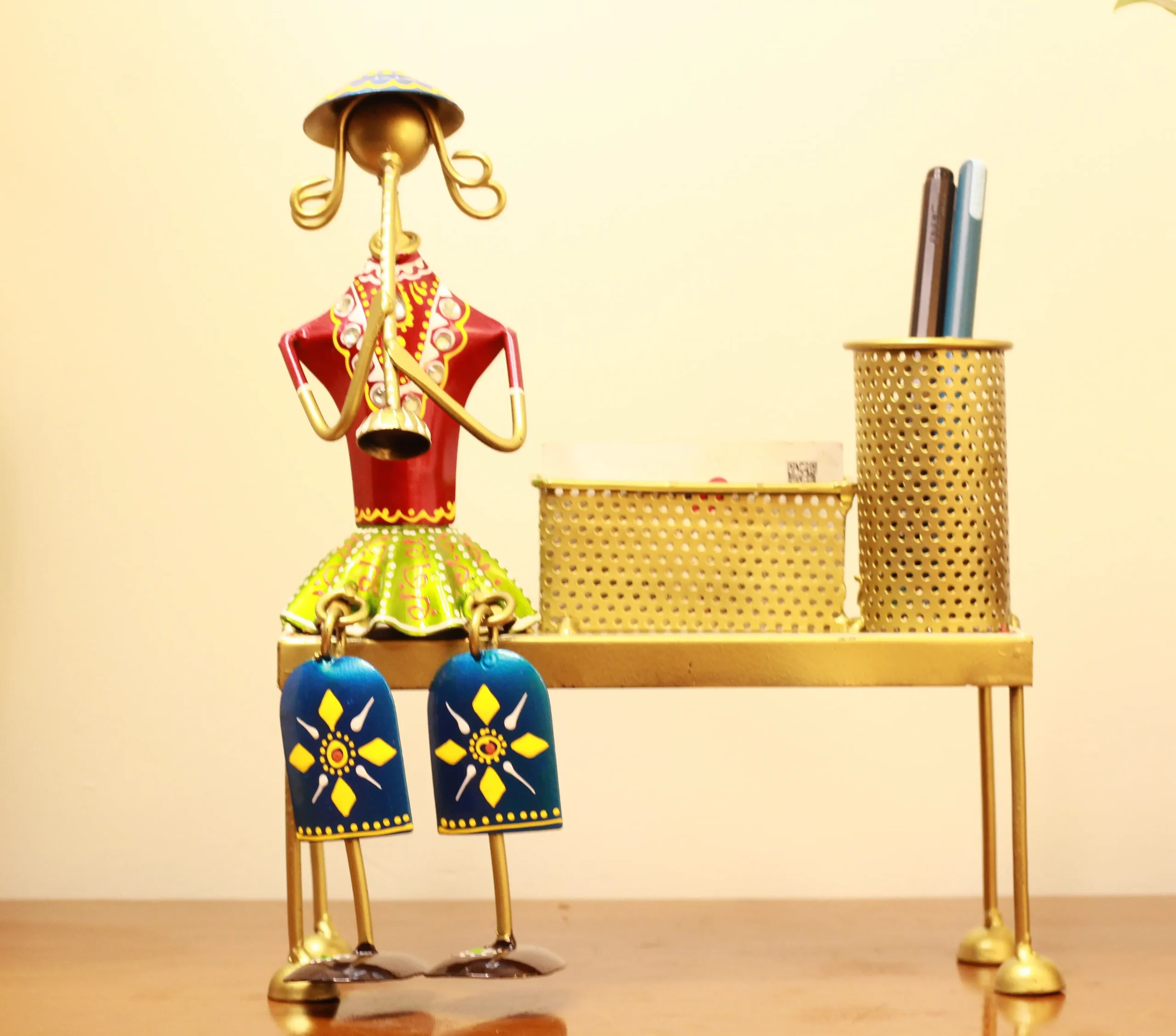 A unique iron decorative piece featuring a man with hanging legs, doubling as a functional card holder and pen stand.