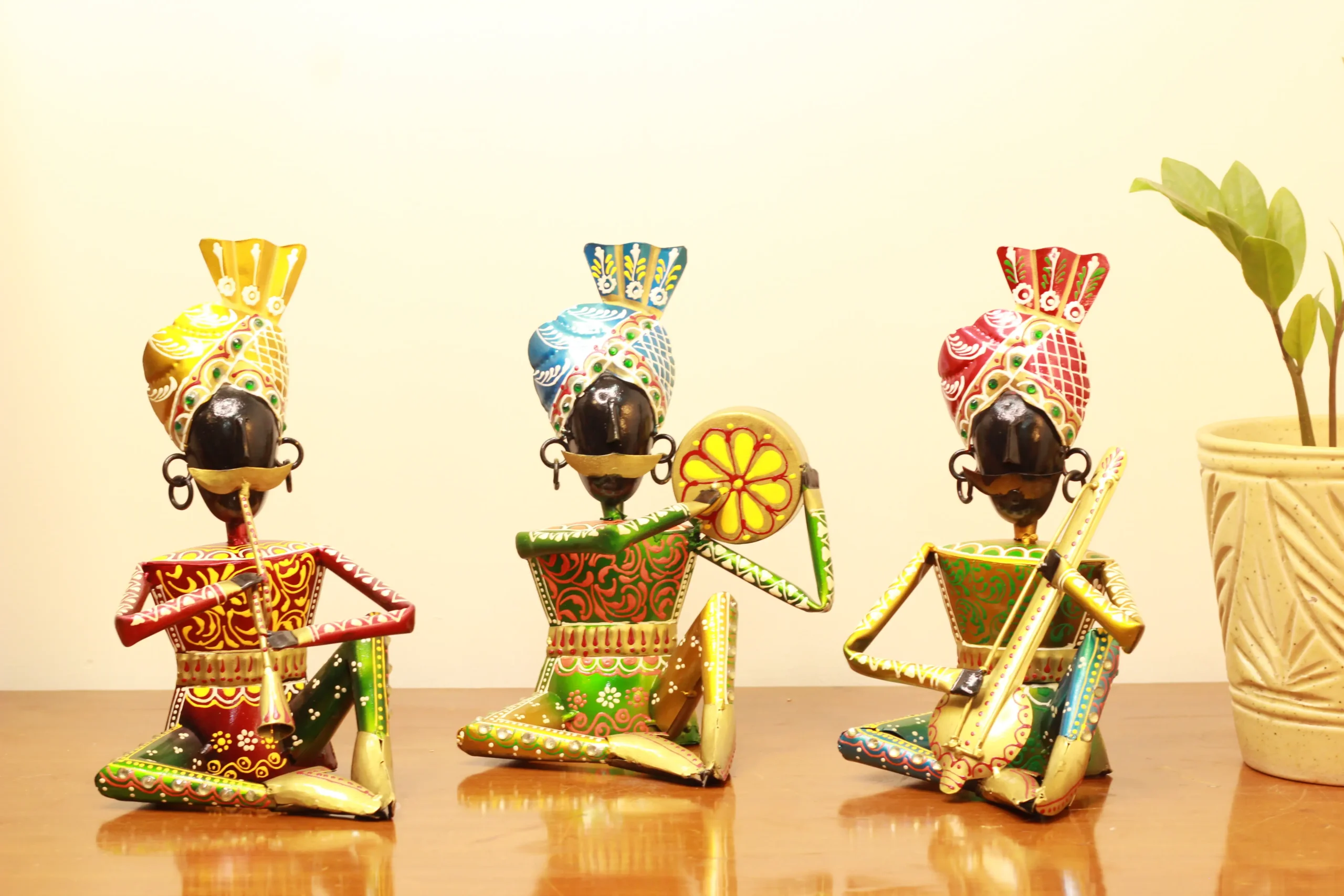 This set of 3 Rajasthani musicians in traditional mooch (mustache) attire adds a vibrant cultural touch to your decor. Perfect for music lovers.