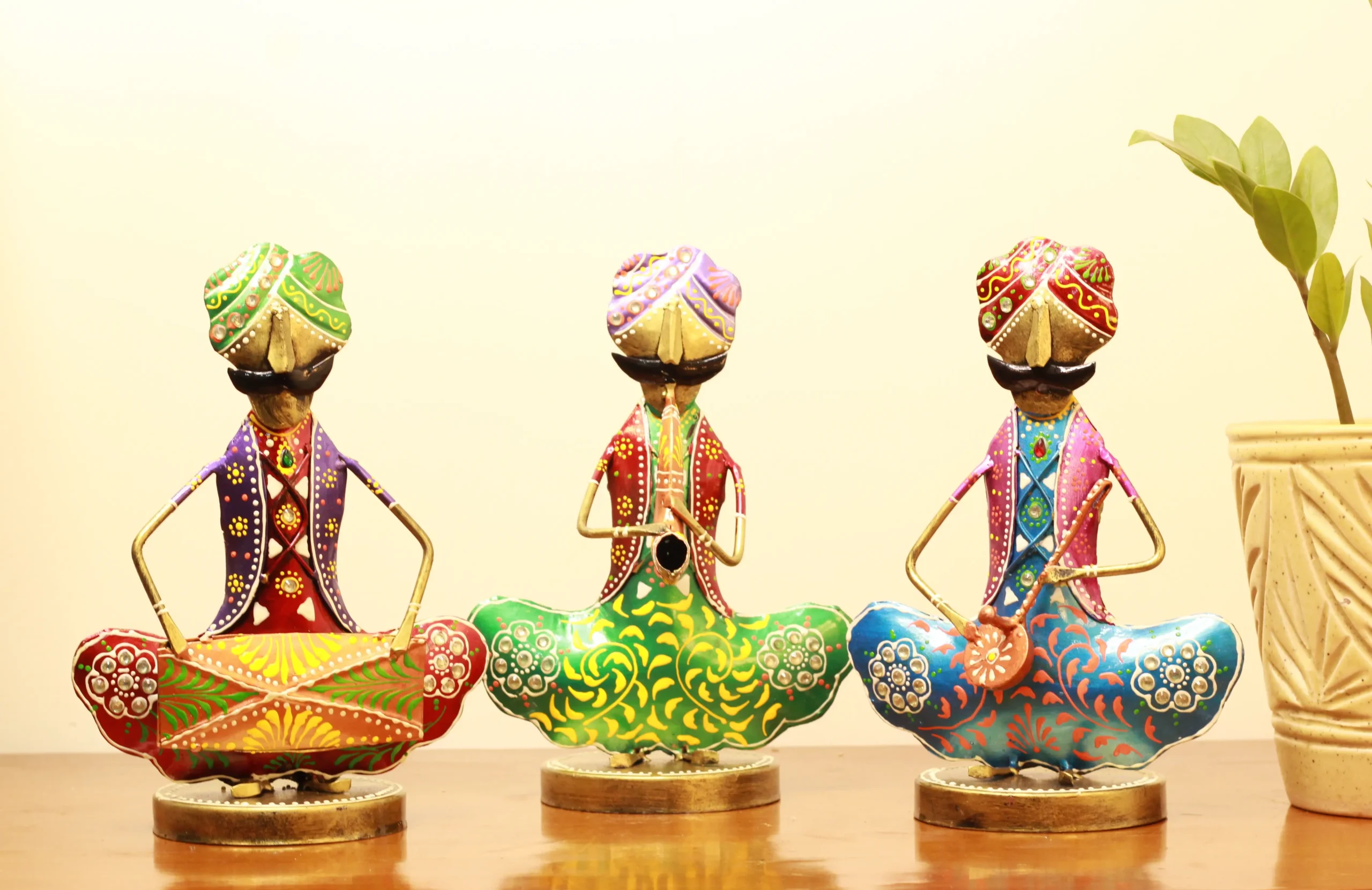 A set of 3 sitting musicians adorned with Rajasthani pagdis (turban), perfect for adding a traditional musical charm to your space.