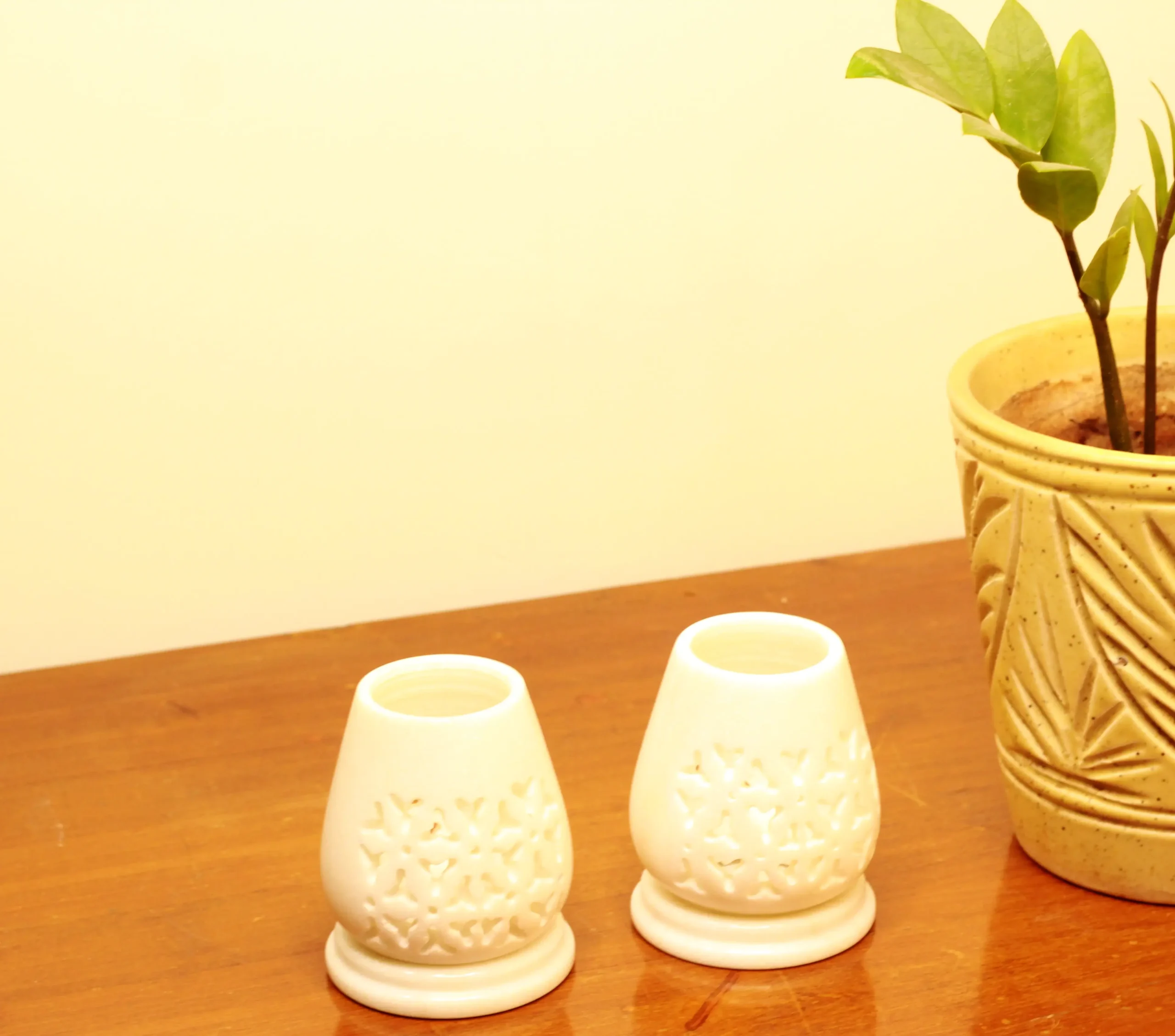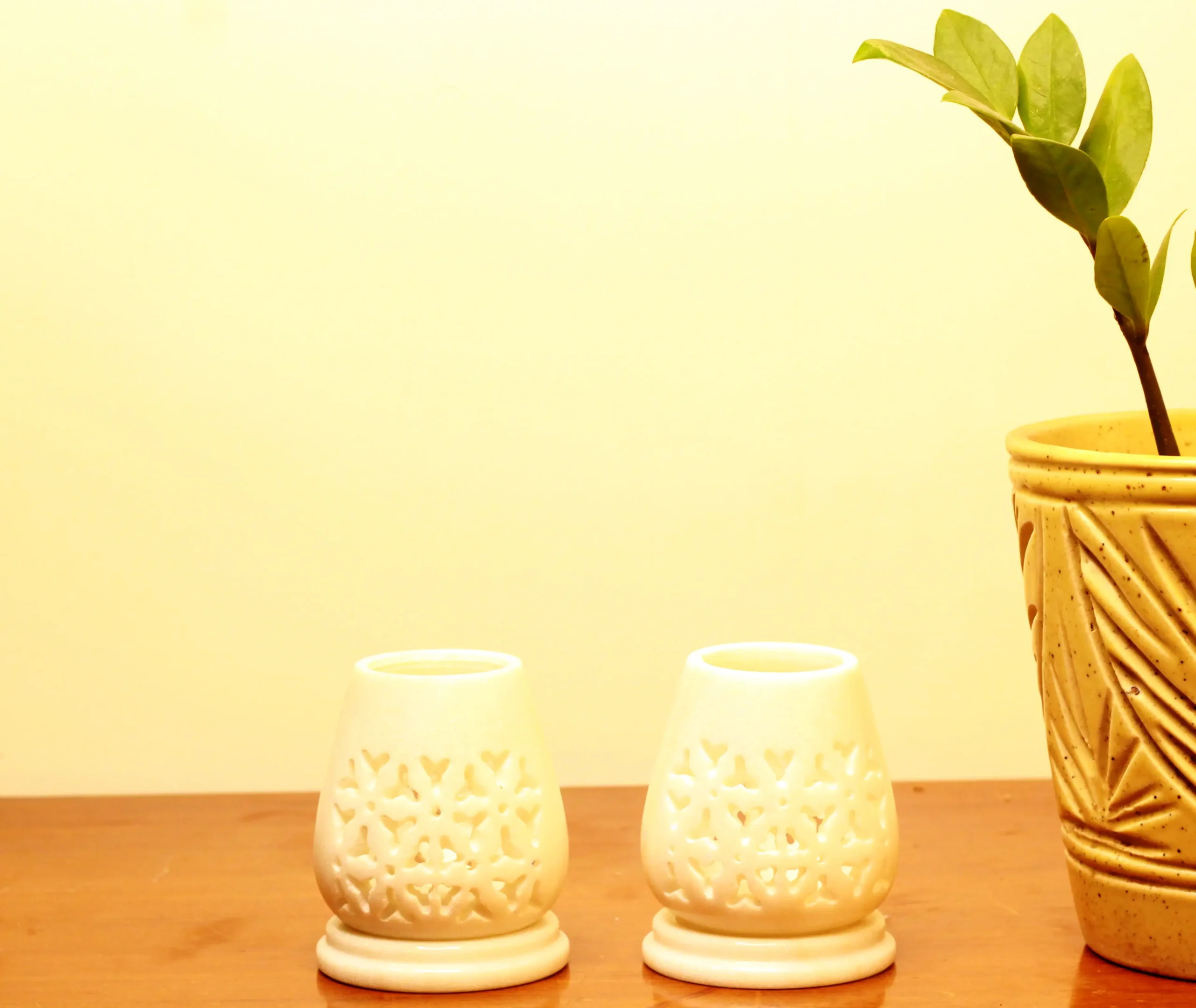 Light up your home with this stunning set of marble Jali T-lights. The intricate design and warm glow make them perfect for creating a cozy, inviting atmosphere, adding a touch of luxury to any room.