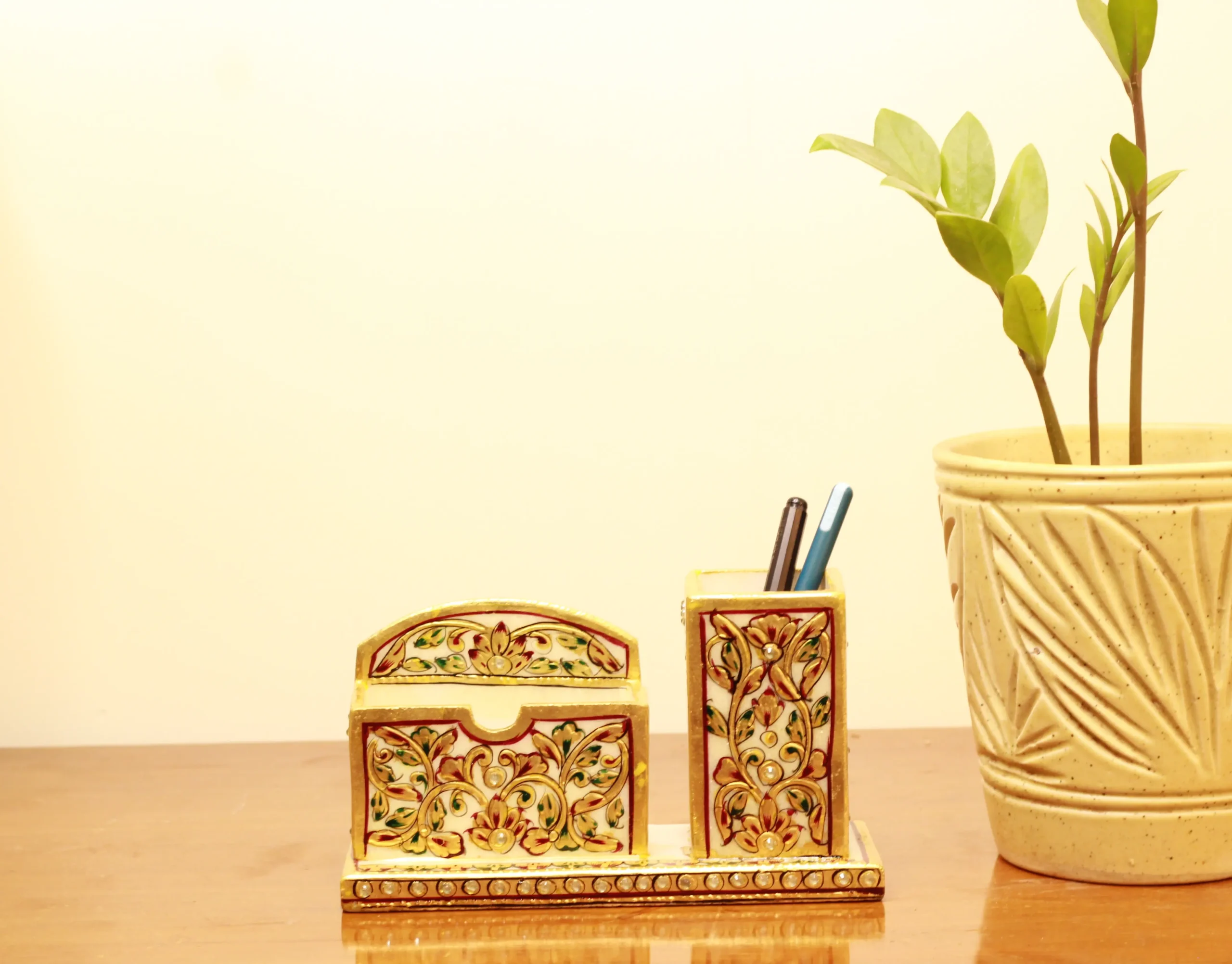 Keep your office essentials neat and stylish with this marble visiting card and pen stand. Crafted from high-quality marble, it adds a modern yet traditional touch to your desk while keeping your cards and pens organized.