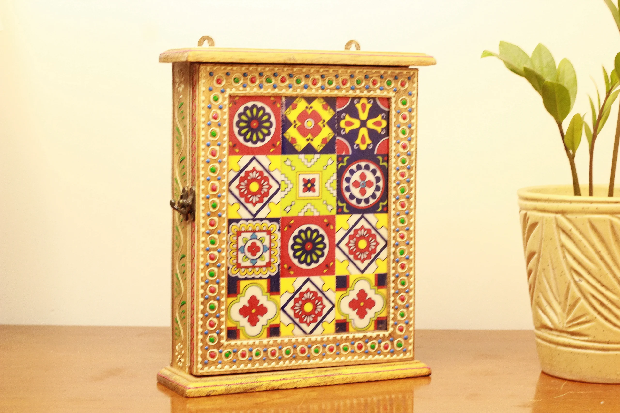 This wooden keybox combines vibrant color embossing with charming blue pottery tiles, offering both style and functionality for your home.